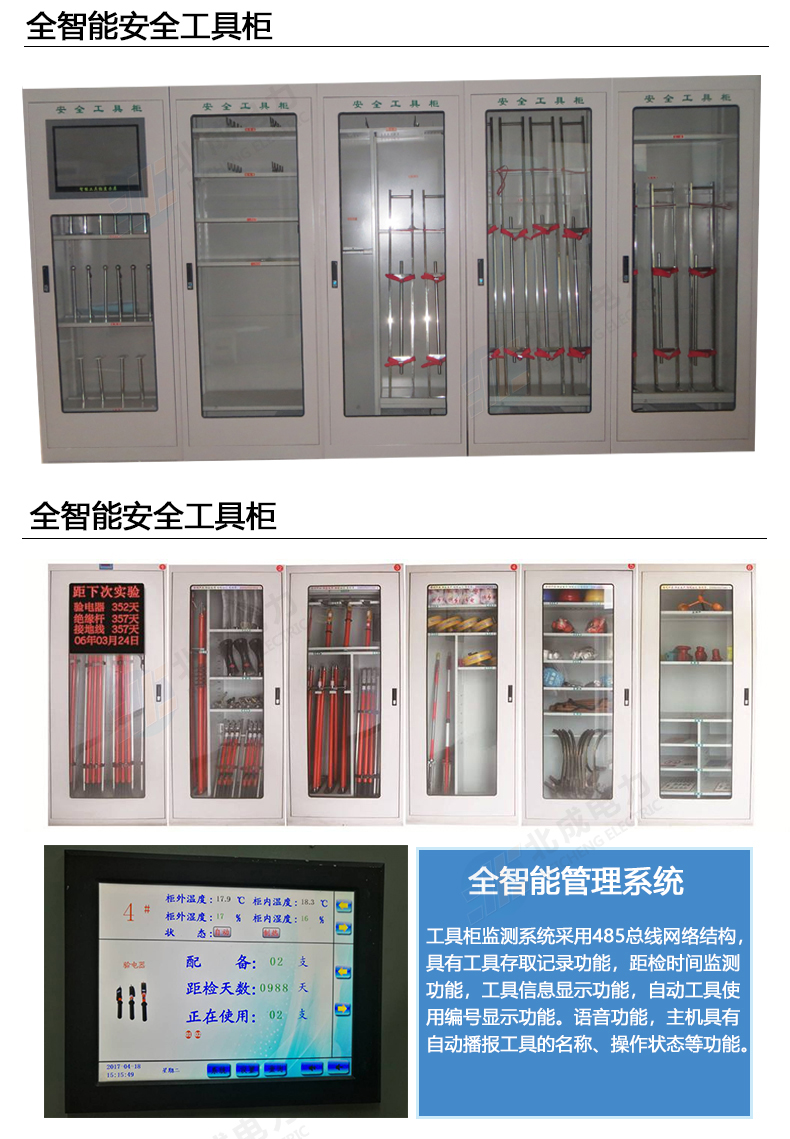 全智能工具柜一般是組合柜,三個工具柜或三個工具柜以上一組,每個工具柜內安有多個探頭,臺柜子上有一個大的LED顯示屏,可以隨時顯示柜內溫度濕度以及柜內每種安全工器具的試驗周期,還顯示使用中絕緣工具的使用數量和編號,絕緣工具拿出使用時柜內開啟識別系統,自動監視絕緣工具使用情況,絕緣工具復位后,自動關閉顯示窗口,恢復工器具試驗周期倒計時狀態。全智能工具柜具有對絕緣工具進行標識和分類管理的功能,能夠識別工具是否放錯了位置,并提醒工具檢驗時間。全智能工具柜微電腦控制,數控兼容,內采用冷凝型除濕機,類似小型空調,控溫除濕,保證絕緣工具使用時更安全。